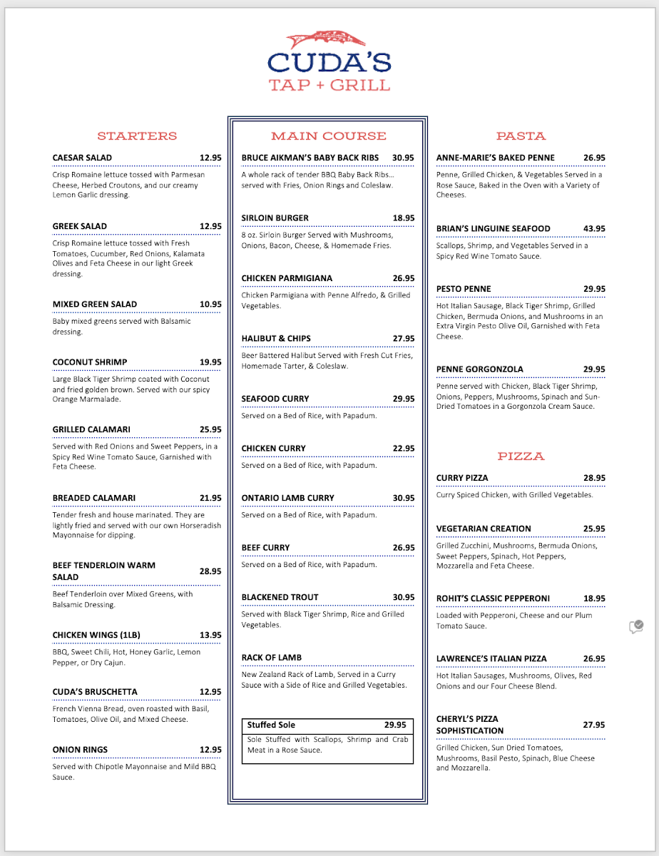 Welcome to Cuda's Tap & Grill, a hidden gem located in the heart of Lorne Park, Mississauga. Despite its unassuming exterior, Cuda’s offers a flavorful journey that captivates the palate. The menu is a delightful medley of dishes, each crafted with care and attention to detail, ensuring a memorable dining experience.